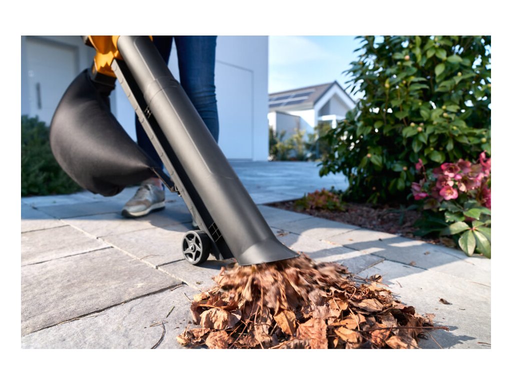 Tento výkonný, akumulátorový stroj můžete používat jako foukač na listí, vysavač a automatický drtič. Nadrcený mulč se shromažďuje v prostorném 45l textilním vaku. Objem odpadu se navíc snižuje na desetinu původního objemu. Když bude hotovo, jednoduše vak otevřete a vysypte obsah na půdu nebo do kompostu. Pokud budete chtít vak omýt, má mechanismus pro rychlé odejmutí. Jednoduše nastavte rychlost vzduchu tak, aby vyhovovala konkrétní práci, a to bez rizika přehřátí odolného 600W bezkartáčového motoru.