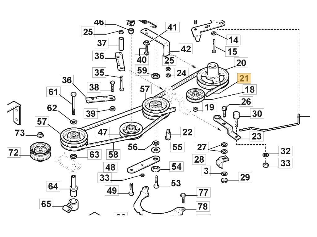 Originální klínový řemen pohonu nožů a příslušenství. Řemen je umítněn na řemenici motoru a vede ke středové dvojřemenici. Zapíná se přes špónovací kladku.